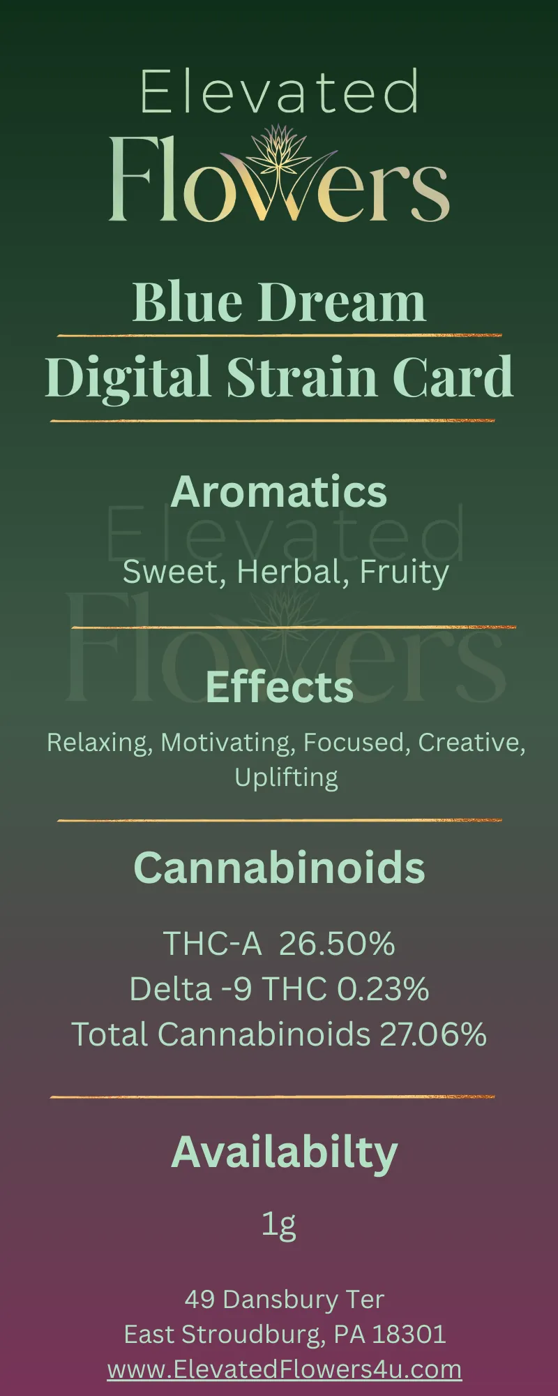 Blue Dream is a widely recognized cultivar known for its sweet berry aroma and balanced experience. The terpene profile often includes myrcene, pinene, and caryophyllene, which contribute to its smooth and enjoyable flavor. Customers often report that Blue Dream offers a gentle combination of relaxation and uplifting mood. This strain is commonly enjoyed during daytime or social activities. Common effects may include: • creative energy • mood elevation • relaxed body sensation Flavor & Aroma Profile Blue Dream is known for its fruity terpene profile. Flavor notes include: • sweet blueberry • herbal earth • light citrus Dominant Terpenes Myrcene Often associated with calming effects. Pinene Provides fresh pine aroma. Caryophyllene Adds subtle spice. Effects Happy Creative Relaxed Flavor Profile Berry Sweet Herbal Dominant Terpenes Myrcene Pinene Caryophyllene