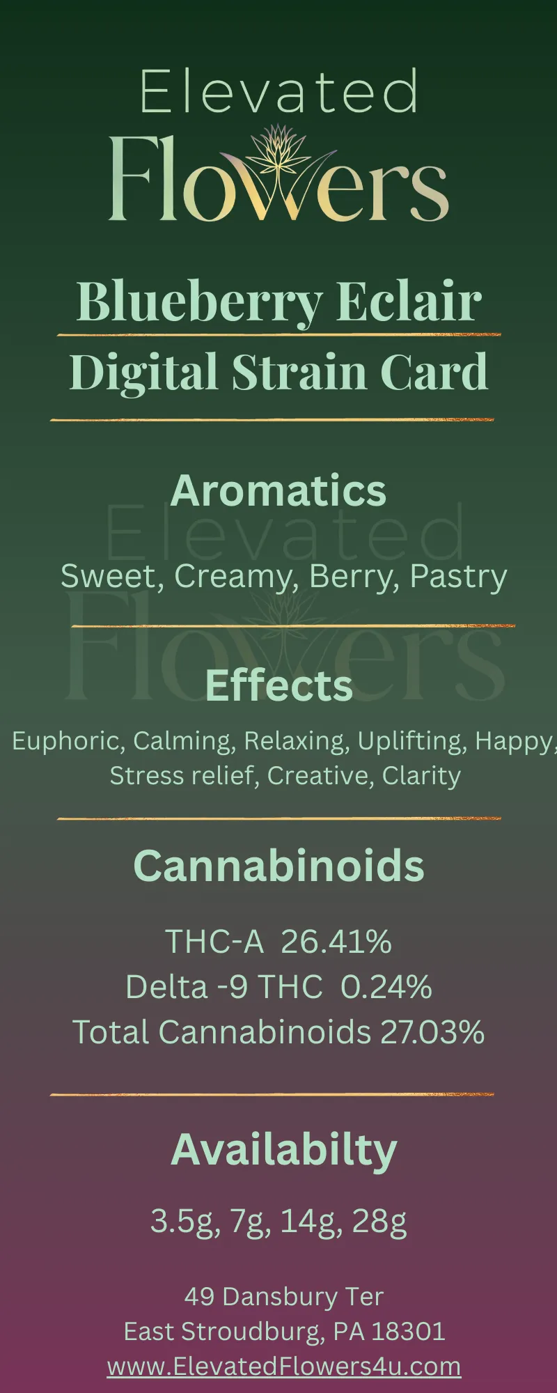 Blueberry Eclair is a flavorful hybrid cultivar known for its creamy berry aroma and dessert-like terpene profile. The strain often features terpenes such as myrcene, limonene, and caryophyllene, which contribute to its smooth and balanced experience. Many consumers enjoy Blueberry Eclair for its sweet pastry flavor and relaxing effects. Customers often report that Blueberry Eclair provides calming and uplifting sensations. This strain is commonly enjoyed during the evening or when relaxing after a busy day. Common effects may include: • relaxation • mood elevation • calm body sensation Flavor & Aroma Profile Blueberry Eclair is known for its rich dessert-style terpene profile. Flavor notes include: • sweet blueberry • creamy pastry • vanilla sugar These flavors come from naturally occurring aromatic compounds called terpenes. Dominant Terpenes Myrcene Often associated with relaxing effects. Limonene Provides bright citrus aroma and uplifting qualities. Caryophyllene Known for its peppery aroma and calming properties. Effects Relaxed Happy Calm Flavor Profile Blueberry Creamy Sweet Dominant Terpenes Myrcene Limonene Caryophyllene