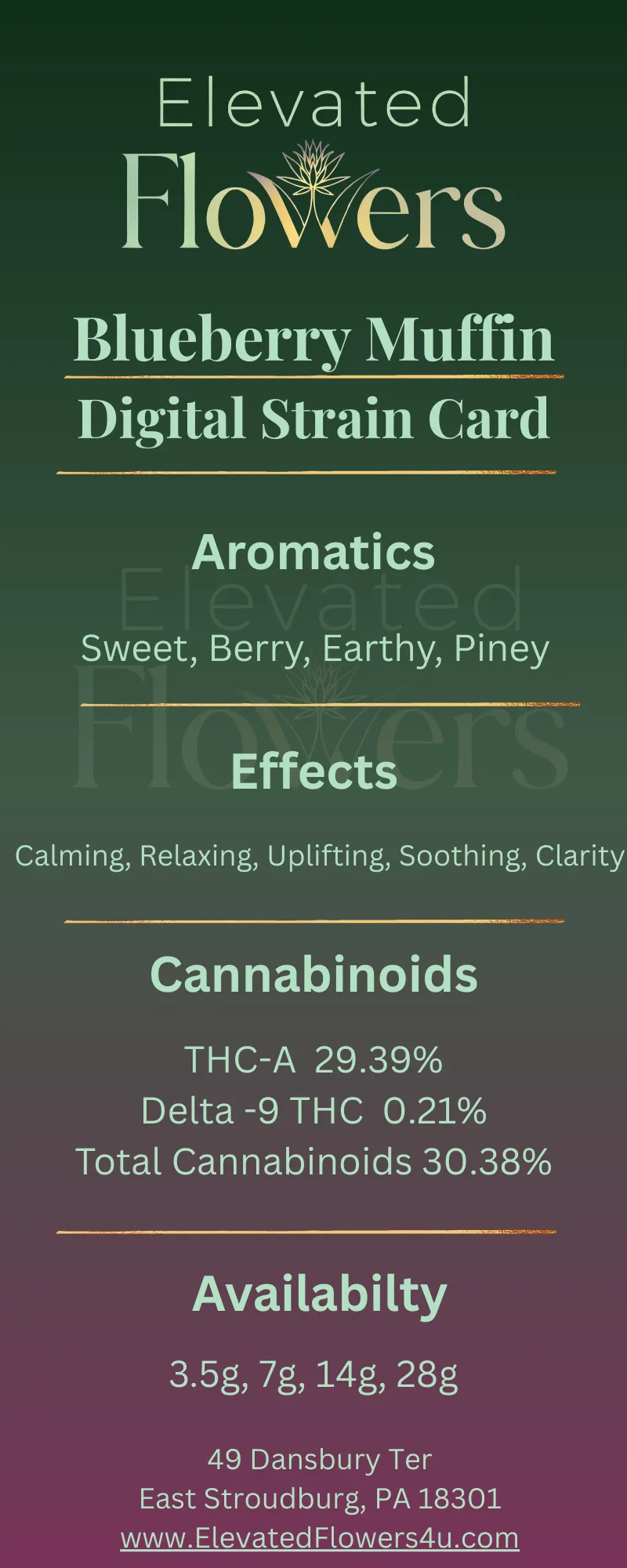 Blueberry Muffin is a popular hybrid strain known for its sweet berry aroma and calming effects. The terpene profile often features myrcene and caryophyllene, which contribute to its relaxing yet balanced experience. Many consumers enjoy Blueberry Muffin for its dessert-like flavor and smooth smoke. Customers often report that Blueberry Muffin provides relaxing and uplifting effects. This strain is commonly enjoyed during the evening or when unwinding after a long day. Common effects may include: • relaxation • mood elevation • stress relief Flavor & Aroma Profile Blueberry Muffin is known for its dessert-like terpene profile. Flavor notes include: • fresh blueberries • sweet vanilla • baked pastry These flavors come from naturally occurring aromatic compounds called terpenes. Dominant Terpenes Myrcene Often associated with relaxing effects. Caryophyllene Known for its peppery aroma and calming properties. Limonene Contributes citrus notes and uplifting effects. Effects Relaxed Calm Happy Flavor Profile Sweet Blueberry Vanilla Dominant Terpenes Myrcene Caryophyllene Limonene