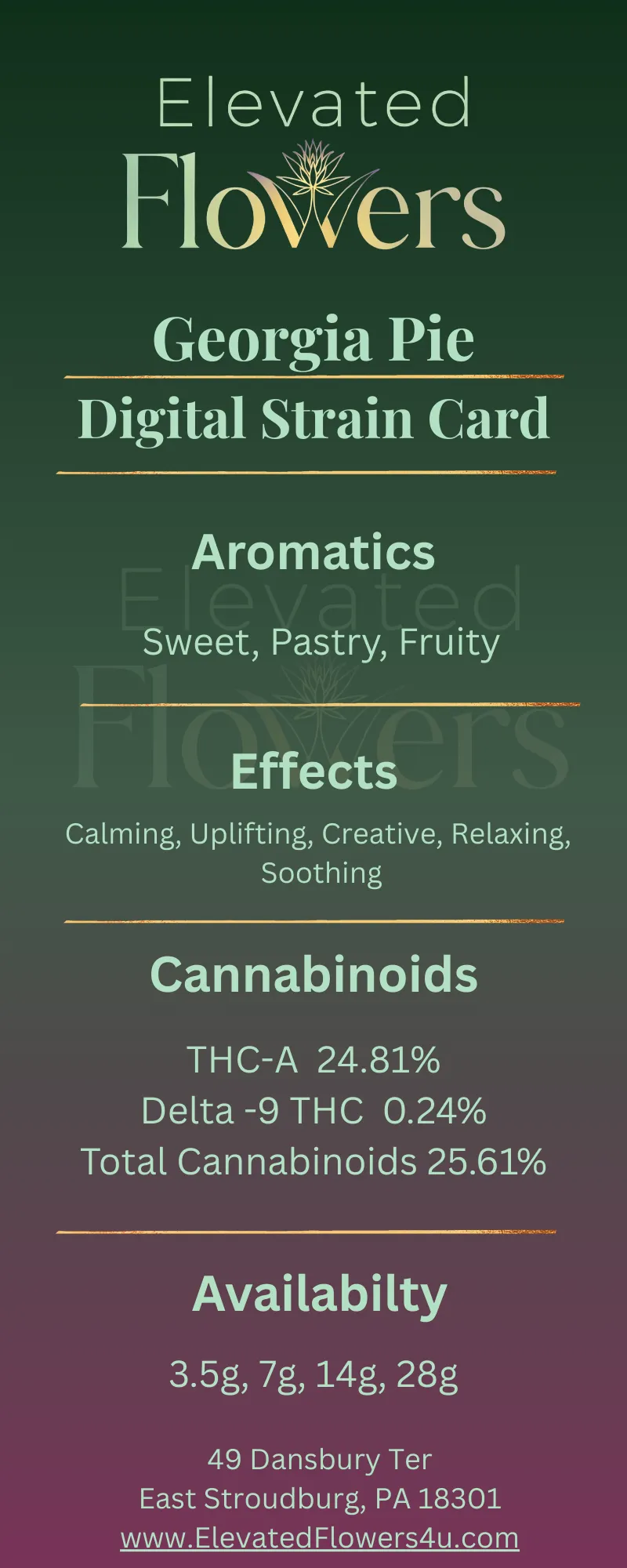 Georgia Pie is a flavorful hybrid known for its sweet dessert aroma and smooth terpene profile. This cultivar commonly features caryophyllene, limonene, and myrcene, creating a balanced and enjoyable experience. Many consumers enjoy Georgia Pie for its peach pastry flavor and relaxing effects. Customers often report that Georgia Pie provides calming sensations and a gentle uplift in mood. This strain is commonly enjoyed during the evening. Common effects may include: • relaxation • mood uplift • calm body sensation Flavor & Aroma Profile Georgia Pie is known for its dessert-style terpene profile. Flavor notes include: • peach pastry • sweet cream • baked sugar These flavors come from naturally occurring aromatic compounds called terpenes. Dominant Terpenes Caryophyllene Known for its spicy aroma and relaxing properties. Limonene Adds citrus brightness. Myrcene Often associated with calming effects. Effects Relaxed Happy Calm Flavor Profile Peach Sweet Creamy Dominant Terpenes Caryophyllene Limonene Myrcene