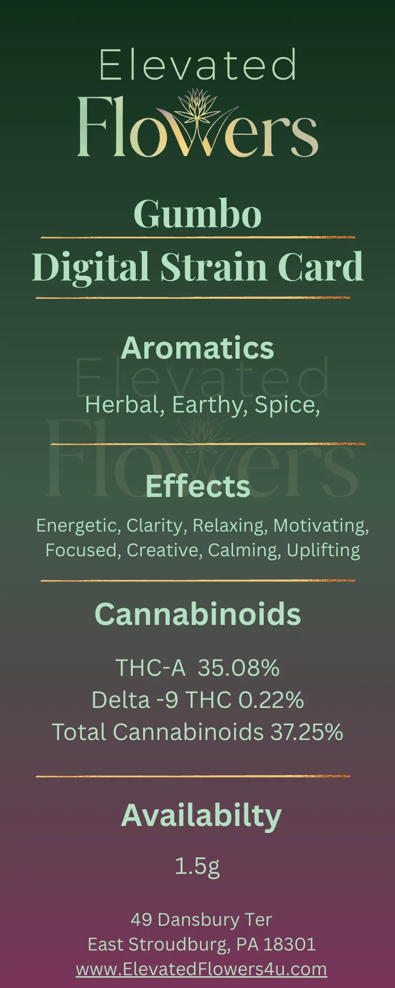 Gumbo is a flavorful cultivar known for its sweet earthy aroma and relaxing terpene profile. It commonly features caryophyllene, myrcene, and limonene, which contribute to its smooth experience. Customers often report that Gumbo delivers calming sensations and a mellow mood. This strain is commonly enjoyed during the evening. Common effects may include: • relaxation • calm mood • stress relief Flavor & Aroma Profile Gumbo is known for its sweet earthy terpene profile. Flavor notes include: • sweet earth • herbal spice • light candy Dominant Terpenes Caryophyllene Known for its peppery aroma. Myrcene Associated with calming effects. Limonene Adds citrus brightness. Effects Relaxed Calm Happy Flavor Profile Earthy Sweet Spicy Dominant Terpenes Caryophyllene Myrcene Limonene