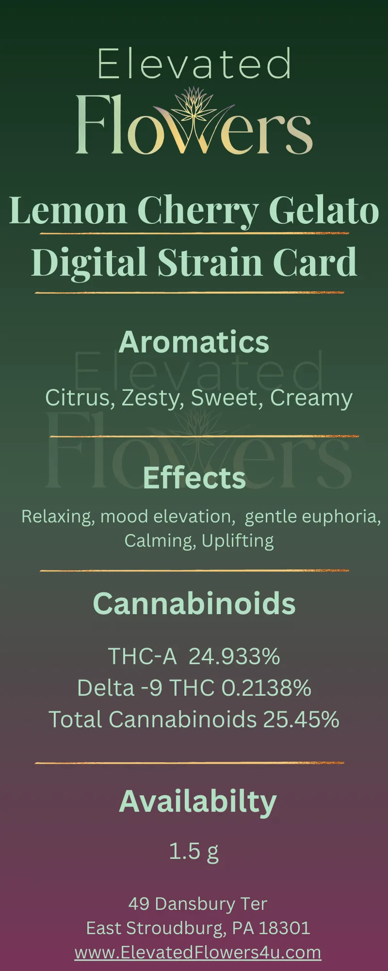 Lemon Cherry Gelato is a flavorful hybrid cultivar known for its bright citrus and sweet cherry aroma. Its terpene profile commonly includes limonene, caryophyllene, and myrcene, contributing to its smooth and balanced experience. Customers often report that Lemon Cherry Gelato offers a relaxing yet uplifting experience. This strain is often enjoyed in the afternoon or evening. Common effects may include: • mood elevation • relaxation • gentle euphoria Flavor & Aroma Profile Lemon Cherry Gelato is known for its citrus dessert terpene profile. Flavor notes include: • lemon zest • sweet cherry • creamy gelato Dominant Terpenes Limonene Provides bright citrus aroma. Caryophyllene Adds subtle spice. Myrcene Associated with calming effects. Effects Happy Relaxed Uplifted Flavor Profile Citrus Cherry Sweet Dominant Terpenes Limonene Caryophyllene Myrcene