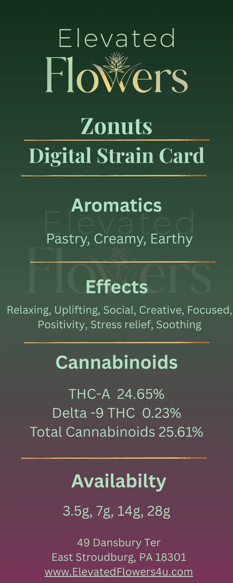 Zonuts is a dessert-inspired hybrid cultivar known for its sweet dough-like aroma and smooth flavor. The terpene profile often includes caryophyllene, limonene, and myrcene, which contribute to its relaxing and enjoyable experience. Many consumers enjoy Zonuts for its bakery-style flavor profile and calming effects. Customers often report that Zonuts delivers a mellow and relaxing sensation. This strain is commonly enjoyed during the evening or when unwinding at home. Common effects may include: • relaxation • calm mood • gentle euphoria Flavor & Aroma Profile Zonuts is known for its sweet bakery-style terpene profile. Flavor notes include: • sweet dough • vanilla cream • light spice These flavors come from naturally occurring aromatic compounds called terpenes. Dominant Terpenes Caryophyllene Known for its spicy aroma and relaxing qualities. Limonene Adds bright citrus notes. Myrcene Often associated with calming sensations. Effects Relaxed Calm Happy Flavor Profile Sweet Doughy Vanilla Dominant Terpenes Caryophyllene Limonene Myrcene